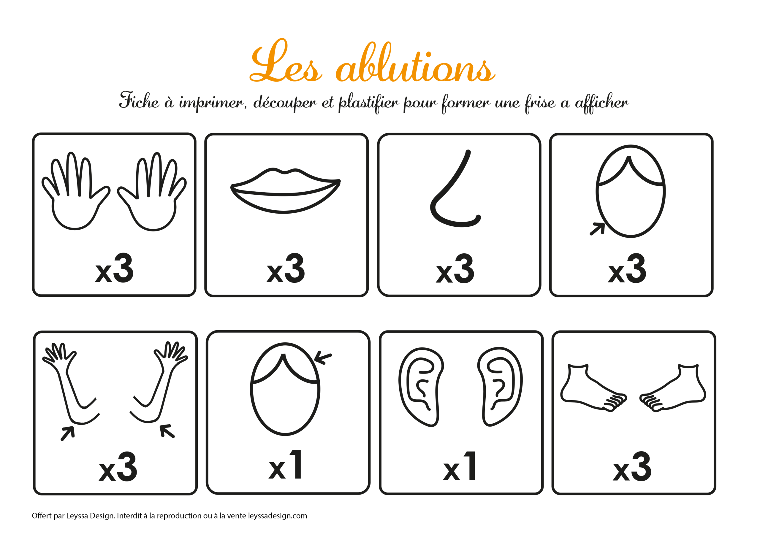 - Découpez les illustrations : Avec des ciseaux, découpez soigneusement chaque icône représentant une étape des ablutions.